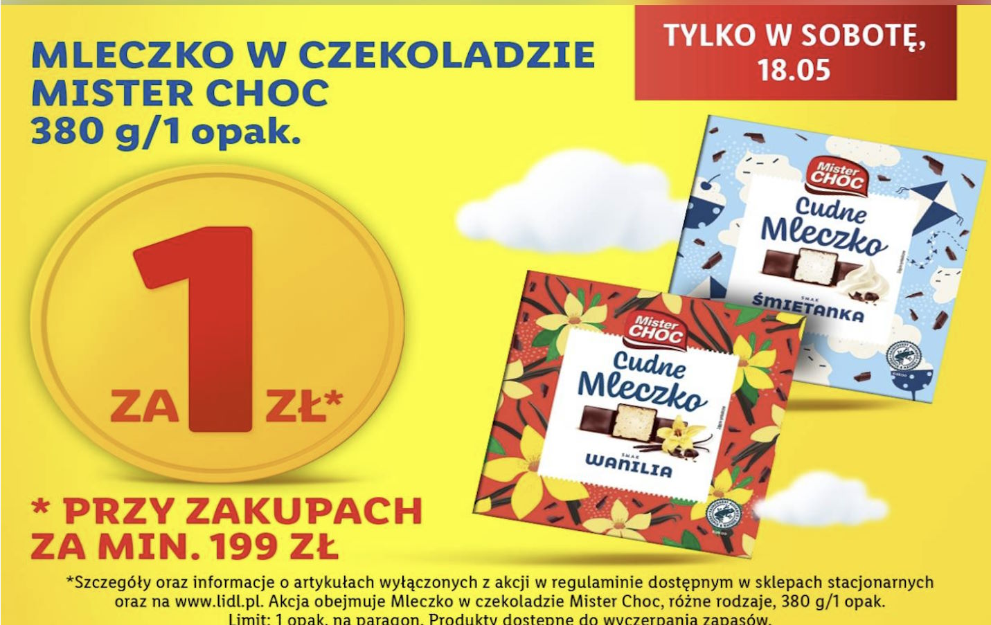 W sobotę, 18 maja, Lidl przygotował prawdziwą niespodziankę dla wszystkich miłośników słodkości. Popularne mleczko w czekoladzie Mister Choc można kupić w promocyjnej cenie zaledwie 1 zł za opakowanie! To wyjątkowa okazja, by zaopatrzyć się w ulubiony przysmak w wyjątkowo atrakcyjnej cenie.