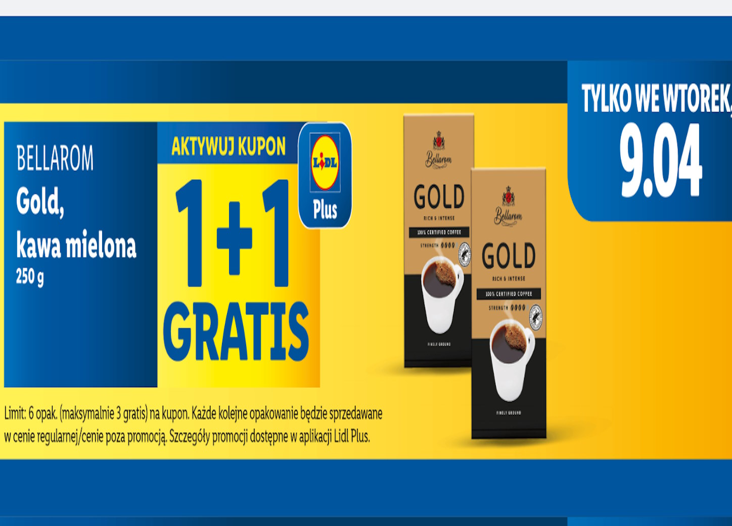 We wtorek sieć sklepów Lidl przyciąga uwagę swoich klientów atrakcyjną promocją, która z pewnością skusi wielbicieli dobrej kawy. W ramach specjalnej oferty „1+1 gratis”, przy zakupie jednej paczki kawy mielonej Bellarom Gold o wadze 250 g, drugą paczkę otrzymamy całkowicie za darmo.