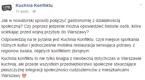 „Jak w nowatorski sposób połączyć gastronomię z działalnością społeczną? Czy poprzez jedzenie można opowiedzieć historie osób, które uciekając przed wojną przybyły do Warszawy?” – odpowiedzią na te pytania ma być nowopowstała restauracja Kuchnia Konfliktu, gdzie uchodźcy zaprezentują mieszkańcom Warszawy dania ze swoich rodzinnych stron.
