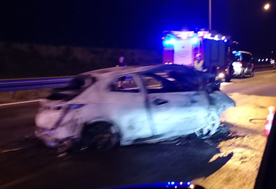 Kierowca został wydobyty z płonącego auta, które spłonęło doszczętnie. Niestety nie jest znany jego stan. Na nagraniu widać z tyłu duże płomienie, jakie wydobywały się z pojazdu.