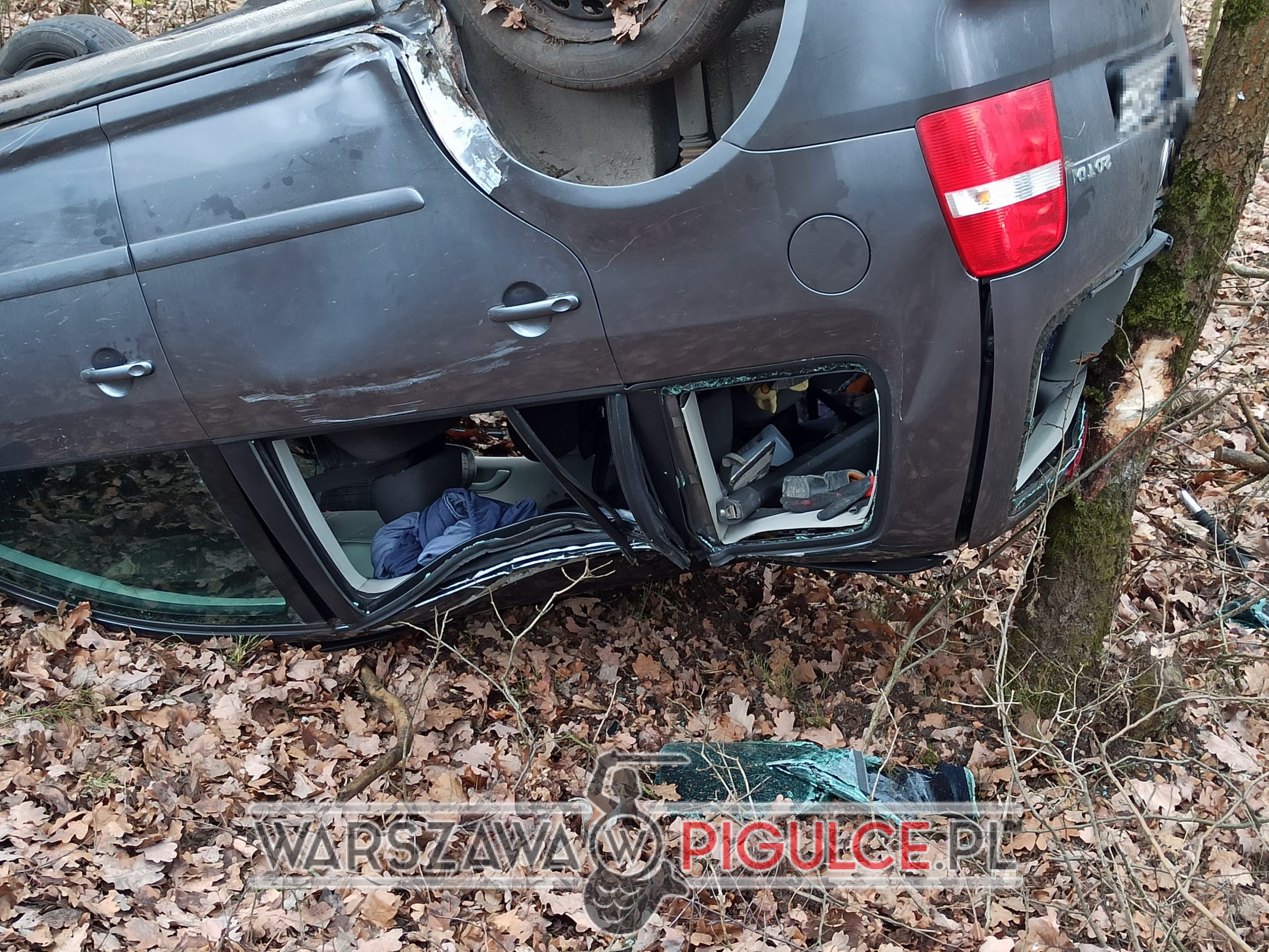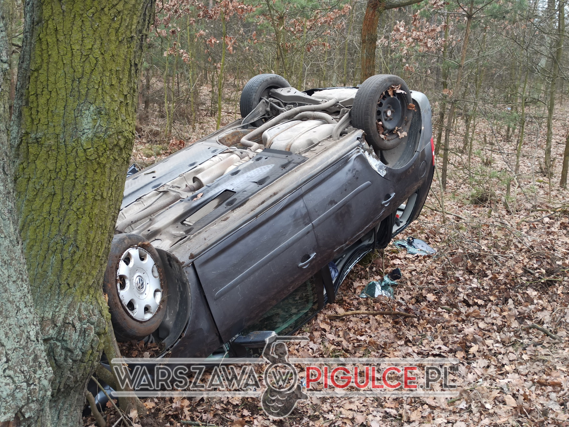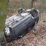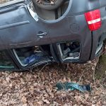 Kierowca samochodu marki Volkswagen, prawdopodobnie na skutek niedostosowania prędkości, wjechał w pobliskie znaki drogowe, dachował i zatrzymał się na drzewie.