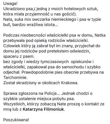 Podczas nieobecności właścicielki psa w domu suczka przebywała pod opieką rodziców właścicielki. Człowiek który ją zabrał był im znany. Pod pretekstem odwiedzin i spaceru z psem wywiózł go do Warszawy.