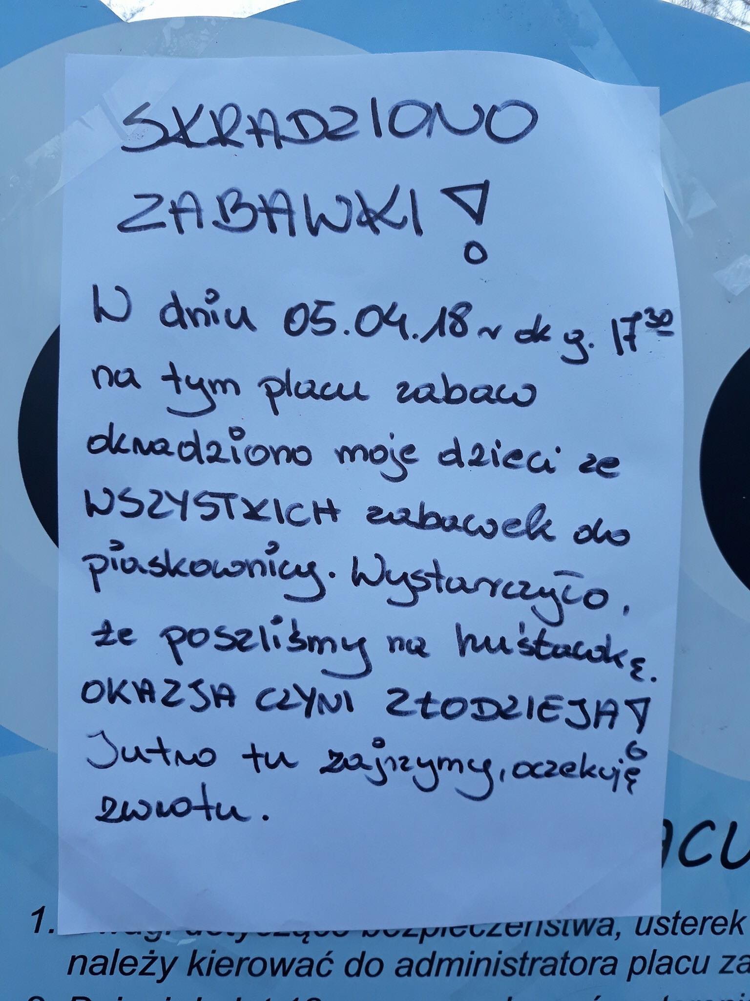 Ukradziono zabawki dwuletnim dzieciom! Złodziej zabrał rzeczy z… placu zabaw
