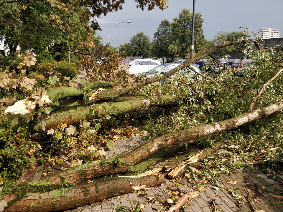 Drzewo spadło na blok, a obok drugie trzeba spadło na zaparkowane dwa samochody osobowe.