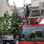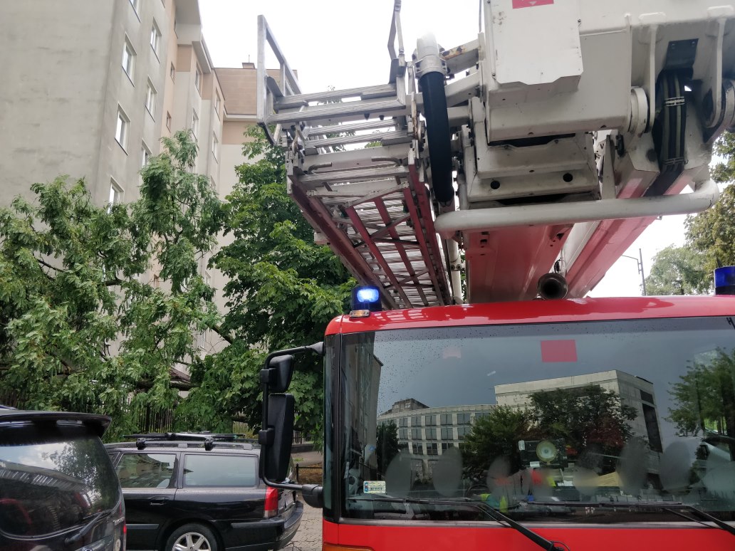 Na miejscu pracuje straż i przy pomocy podnośnika stara się posprzątać okolicę.