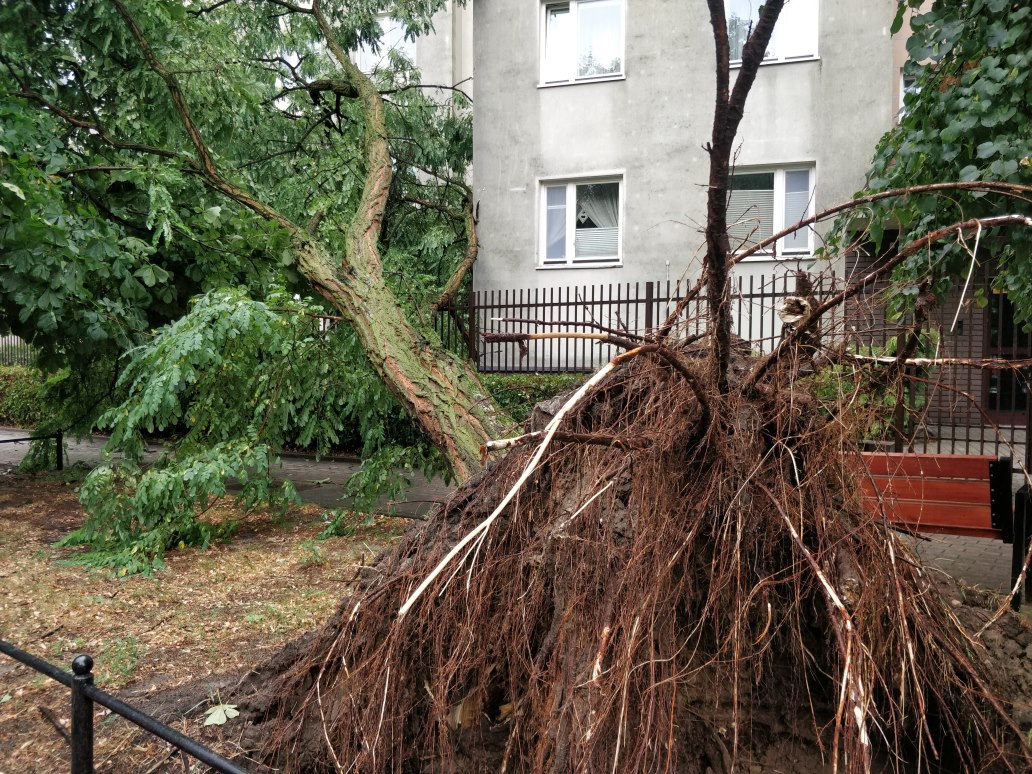 Na ulicy Literackiej na Bielanach drzewo wyrwane wraz z korzeniami spadło na blok mieszkalny. Ulica jest całkowicie zablokowana.