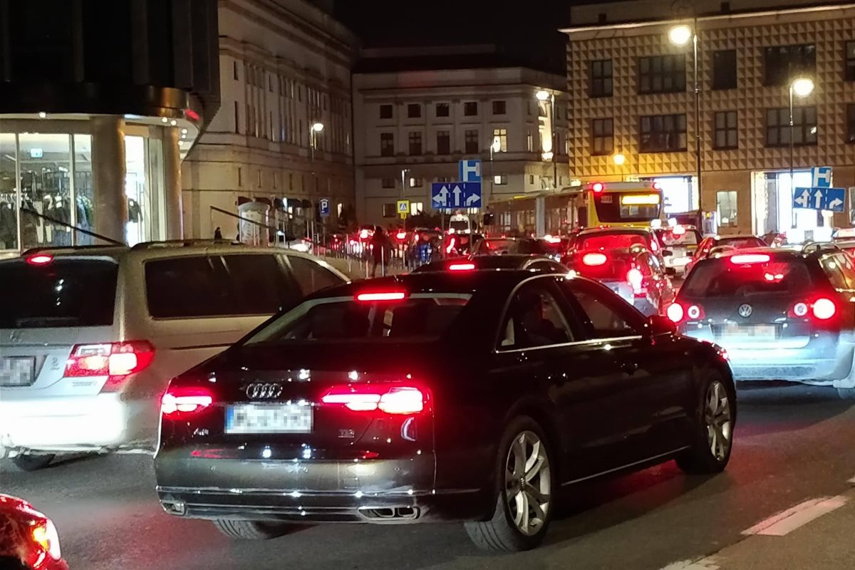 Z powodu zamknięcia niektórych ulic, a także ogromnej popularności iluminacji i pokazów w Multimedialnym Parku Fontann śródmiejskie ulice stoją w ogromnych korkach. Na autobus czeka się ponad godzinę.
