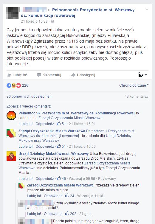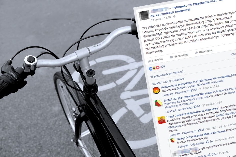 Jeden z użytkowników Facebooka zamieścił na profilu Pełnomocnika ds. komunikacji rowerowej prośbę o uprzątnięcie DDR na Bukowińskiej. Zaczęła się przerzucanie odpowiedzialnością.