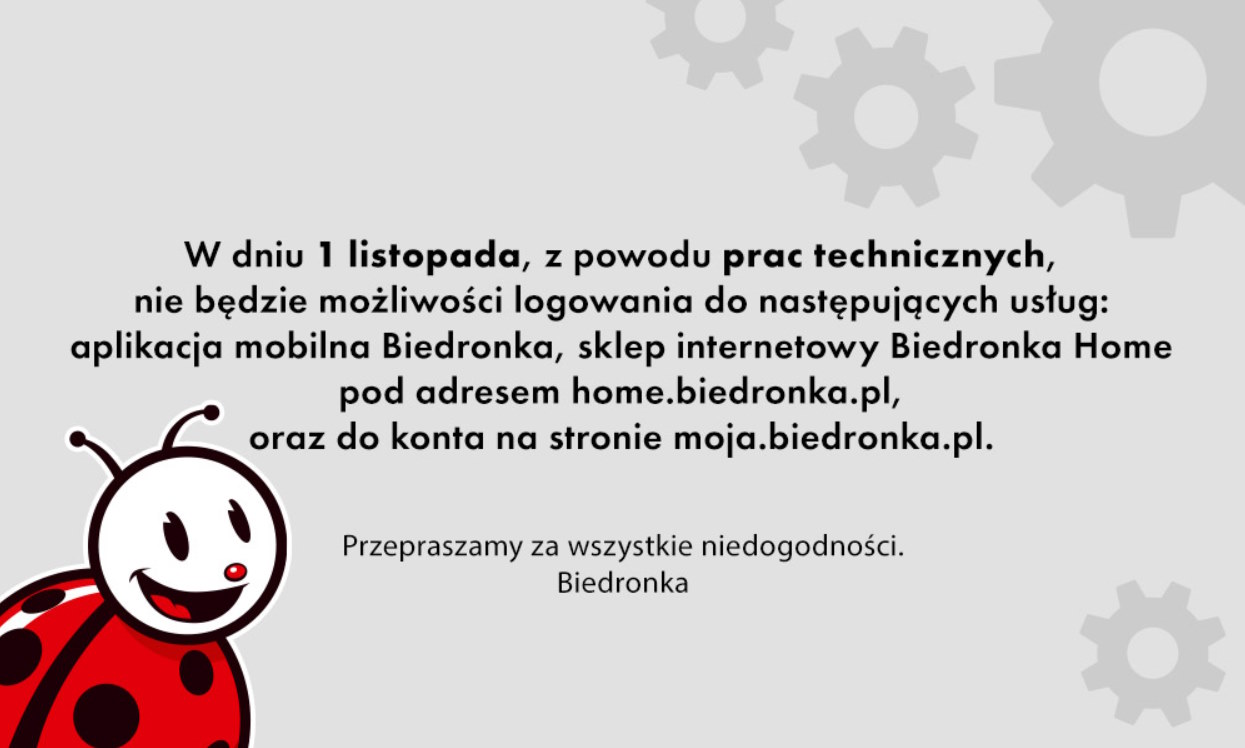 W związku z planowanymi pracami technicznymi, w dniu 1 listopada br., klienci sieci Biedronka mogą napotkać pewne utrudnienia w dostępie do elektronicznych usług oferowanych przez sklep.