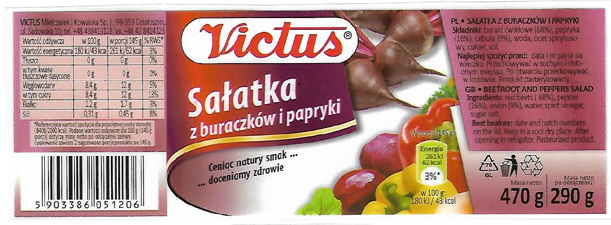 - Nazwa produktu: Sałatka z buraczków i papryki Victus á 470 g
