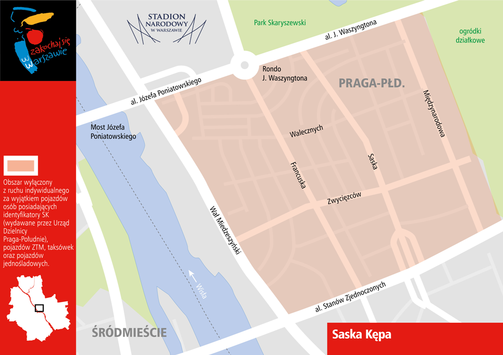 Od godziny 14.00 obszar Saskiej Kępy ograniczony ulicami: al. Księcia Józefa Poniatowskiego, al. J. Waszyngtona, ul. Międzynarodowej, al. Stanów Zjednoczonych oraz Wał Miedzeszyński będzie wyłączony z ruchu indywidualnego za wyjątkiem pojazdów osób posiadających identyfikatory SK (wydawane przez Urząd Dzielnicy Praga-Południe), pojazdów ZTM, taksówek oraz pojazdów jednośladowych. Otwarcie zamkniętego obszaru nastąpi około godziny 16.00.