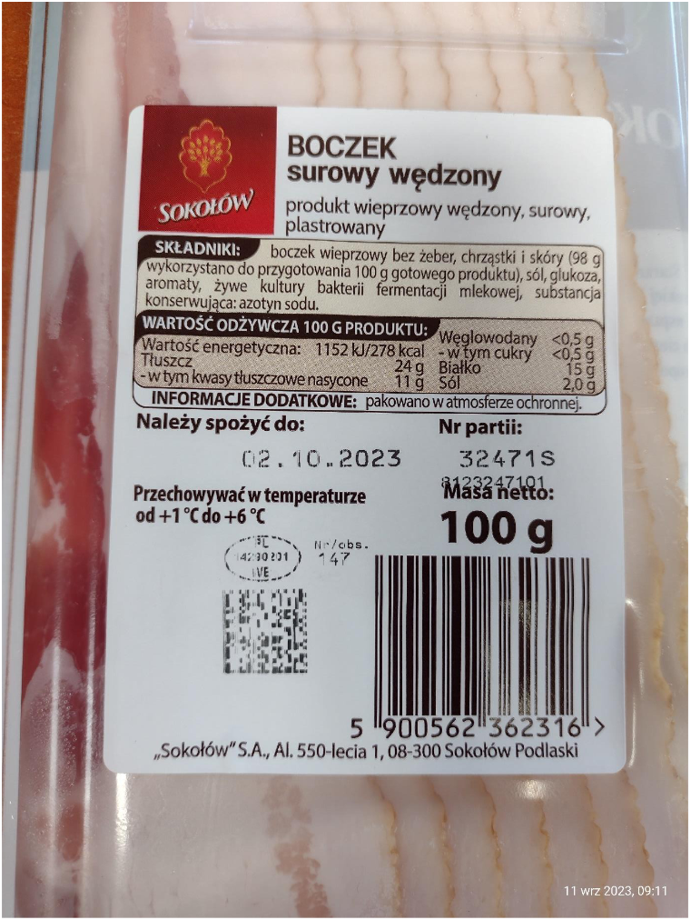 - Nazwa: Boczek surowy wędzony Sokołów 100 g