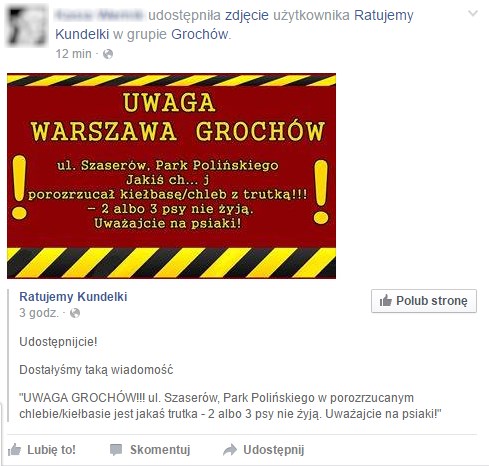 Uwaga Grochów! Kiełbasa z trutką na Szaserów i w Parku Polińskiego!