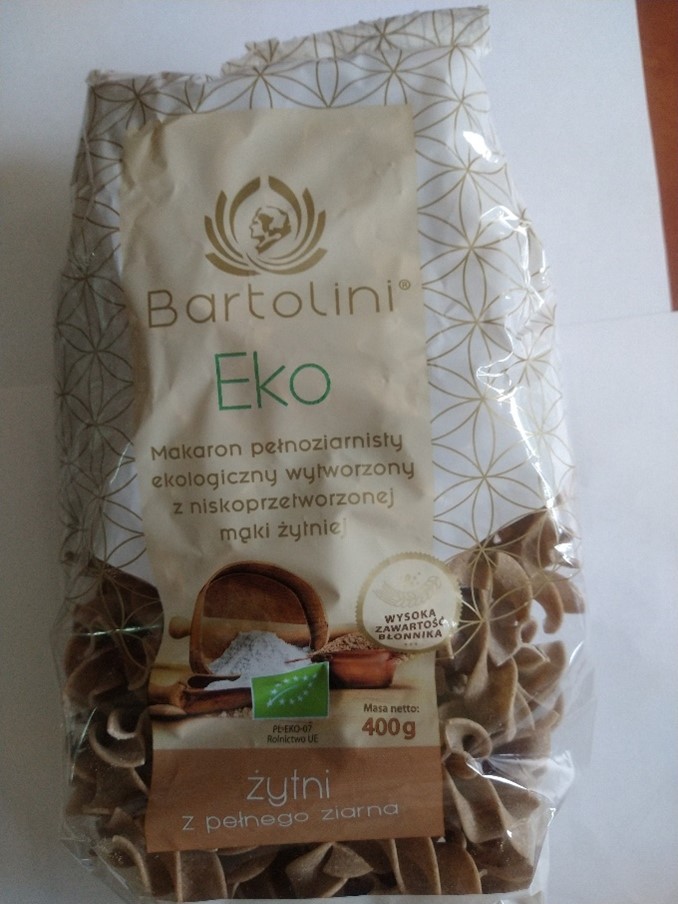 Produkt: Bartolini Eko makaron 100 % żytni pełnoziarnisty (ekologiczny), muszla Nr 2, masa netto 400 g,