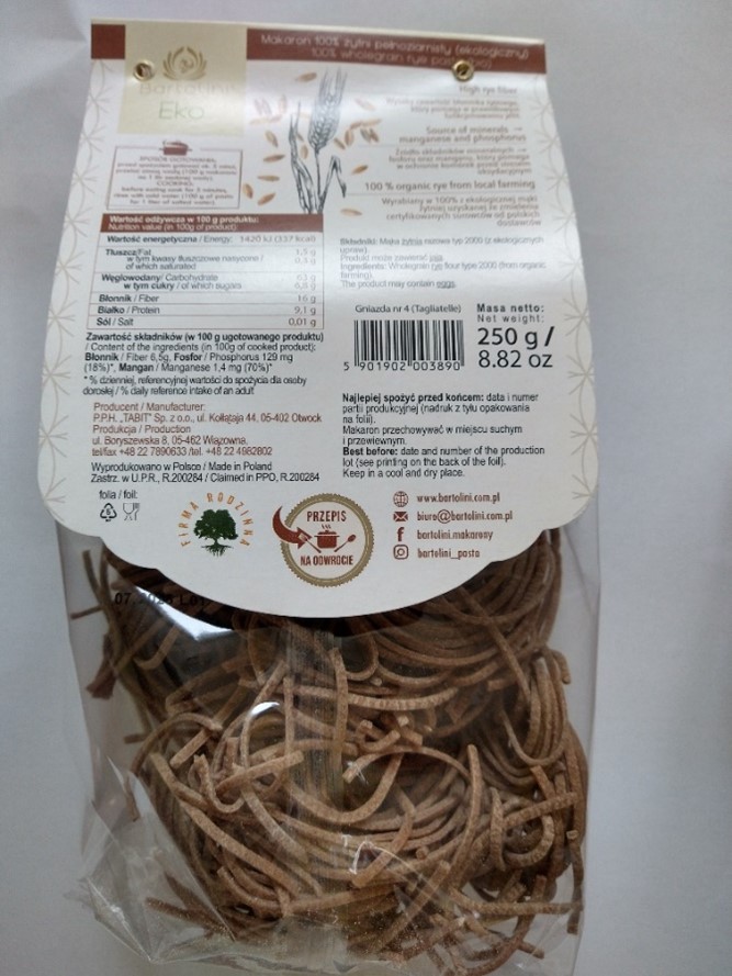 Produkt: Bartolini Eko makaron 100 % żytni pełnoziarnisty (ekologiczny), gniazda Nr 4 (tagliatelle), masa netto 250 g,