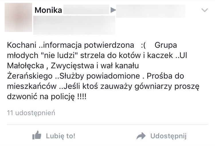 Grupa młodych „nie ludzi” strzela do kotów i kaczek ..ul Małołęcka , Zwycięstwa i wał kanału Żerańskiego ..Służby powiadomione . Prośba do mieszkańców ..Jeśli ktoś zauważy gówniarzy proszę dzwonić na policję !!!!” – napisała Pani Monika na Facebooku. Uważajcie na siebie i swoje zwierzęta.