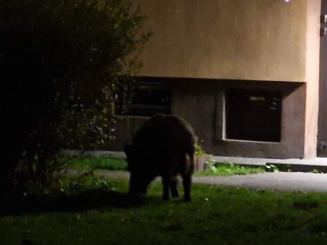 Przy ulicy Króla Maciusia 13A na Marysinie Wawerskim pod blokami spaceruje dzik.