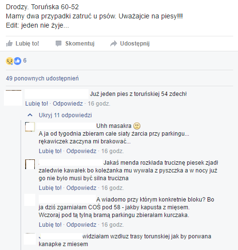 Wczoraj przy Toruńskiej 60-52 zanotowano dwa przypadki zatruć u psów. Jeden nie żyje.