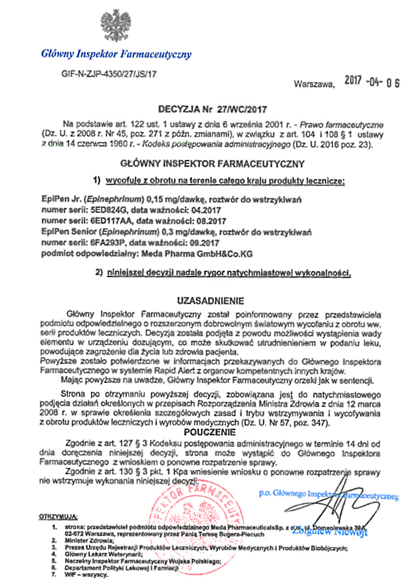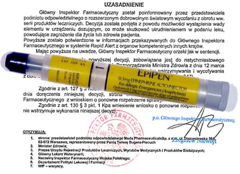 Uwaga! Lek ratujący życie alergikom wycofany z obrotu! „Utrudnienia w podaniu, powodujące zagrożenie dla życia lub zdrowia pacjenta”