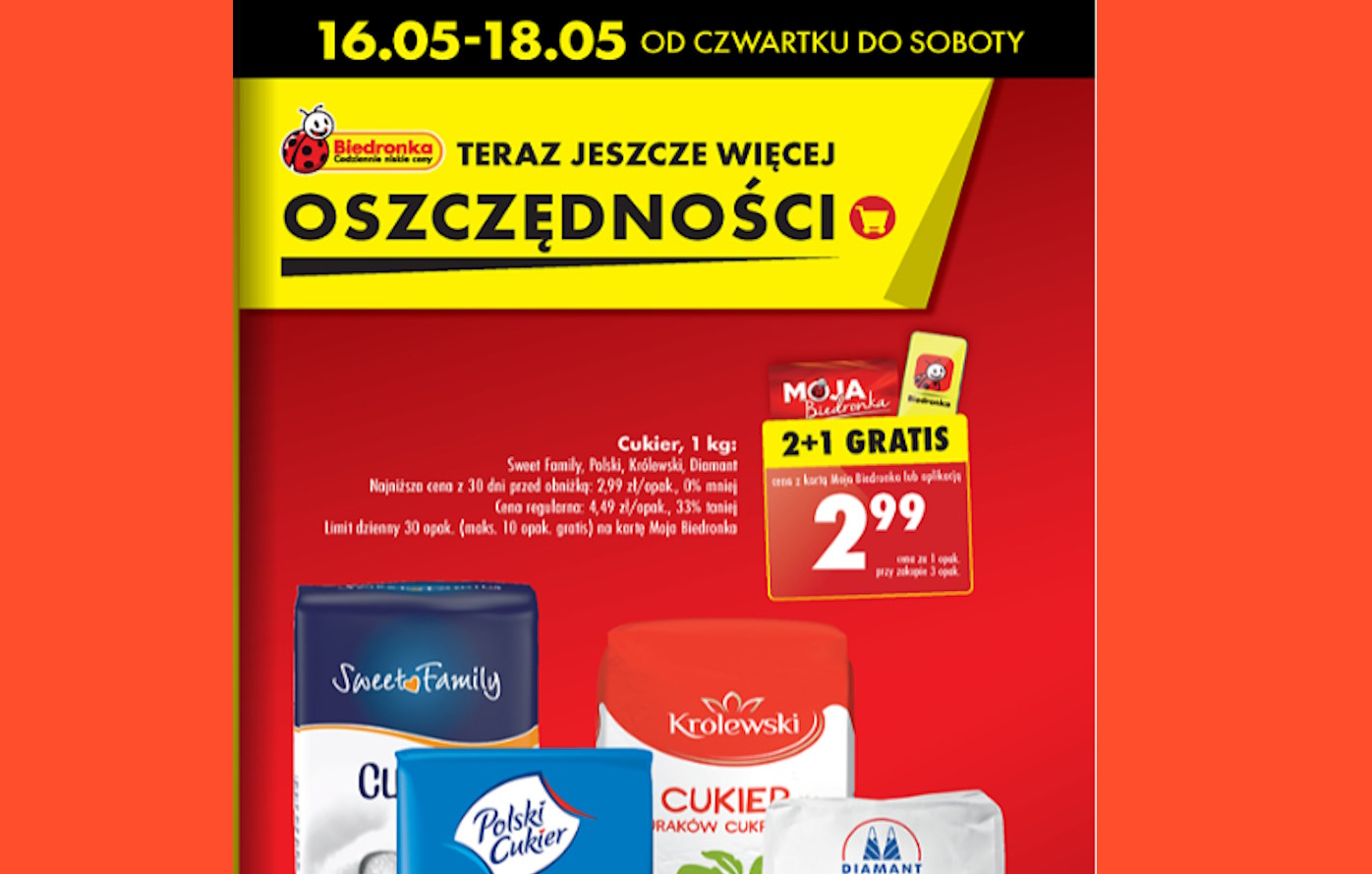 Promocje takie jak ta nie zdarzają się często, dlatego warto już teraz zaplanować zakupy w Biedronce. Cukier to produkt, który zawsze się przyda, a dzięki tej rewelacyjnej ofercie można go kupić w jeszcze lepszej cenie. Pamiętaj, że promocja obowiązuje tylko od czwartku, 16 maja, do soboty, 18 maja, więc nie zwlekaj i odwiedź najbliższy sklep Biedronka.