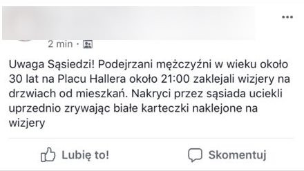 „Uwaga Sąsiedzi! Podejrzani mężczyźni w wieku około 30 lat na Placu Hallera około 21:00 zaklejali wizjery na drzwiach od mieszkań.” – ostrzega Pan Przemysław.