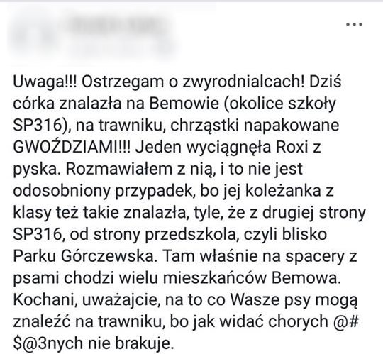 Swego czasu wielokrotnie pisaliśmy, a nawet mówiliśmy o niehumanitarnych pomysłach ludzi, którzy wyrzucają na trawniki zatrute lub naszpikowane gwoździami mięso. Wydawać by się mogło, że szum medialny zrobił swoje. Niestety problem powrócił.