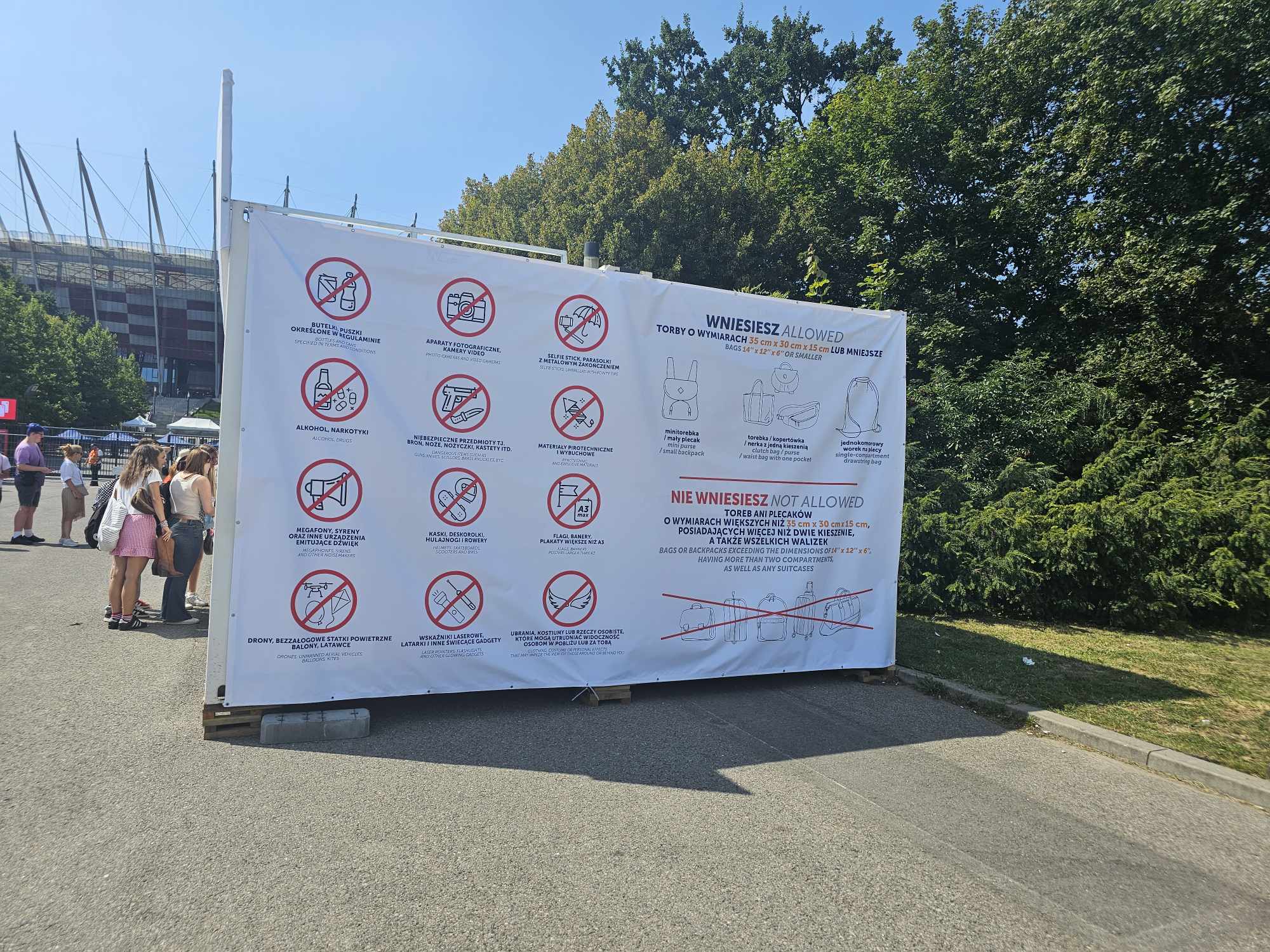 - Duże torby i plecaki – Torby większe niż 30x30x15 cm są zabronione. Dla wygody i bezpieczeństwa, zachęca się do przynoszenia mniejszych torebek.