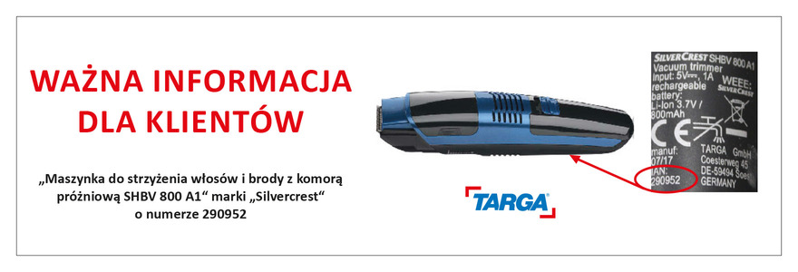 „Soest, 23. marca 2018 roku. Firma TARGA GmbH w trosce o bezpieczeństwo konsumentów wycofuje obecnie z rynku produkt „Maszynka do strzyżenia włosów i brody z komorą próżniową SHBV 800 A1“ marki „Silvercrest“ o numerze 290952 (patrz tabliczka znamionowa na spodzie urządzenia)” – informuje dyskont.