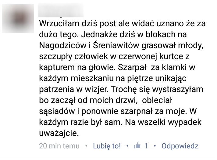 Jedna z użytkowniczek Facebooka z Białołęki postanowiła ostrzec sąsiadów. Nieproszoną wizytę złożył jej młody człowiek w kapturze, który szarpał za klamki jej i sąsiadów. Następnie oddalił się. Jest to znana metoda złodziei, którzy testują czy ktoś znajduje się w domu. Ostatnio bardzo dużo takich sygnałów płynie z okolic Białołęki i Tarchomina.