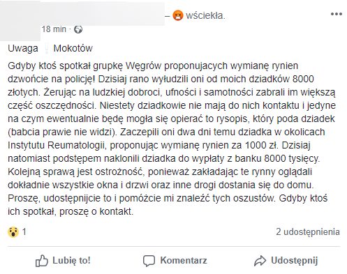„Gdyby ktoś spotkał grupkę Węgrów proponujących wymianę rynien dzwońcie na policję! Dzisiaj rano wyłudzili oni od moich dziadków 8000 złotych.” – ostrzega użytkowniczka Facebooka.