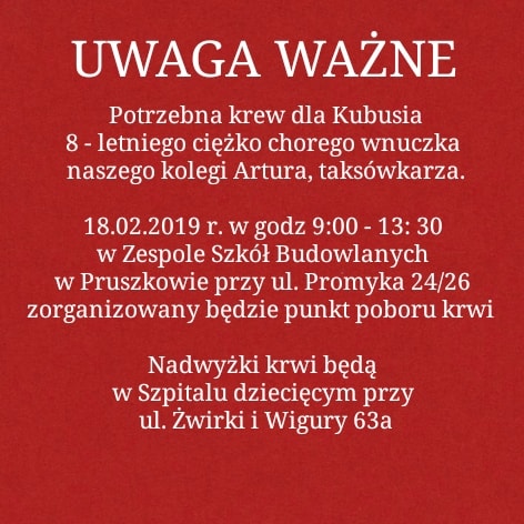 Na fanpage Alarm Taxi Warszawa pojawił się dramatyczny apel o krew dla wnuczka jednego z taksówkarzy. Kubuś choruje na raka płuc. Rak jest złośliwy są już przerzuty.