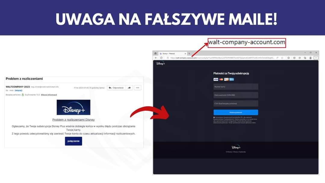 Oszuści często wykorzystują znane marki, takie jak Disney+, aby zwiększyć wiarygodność swoich fałszywych komunikatów.
