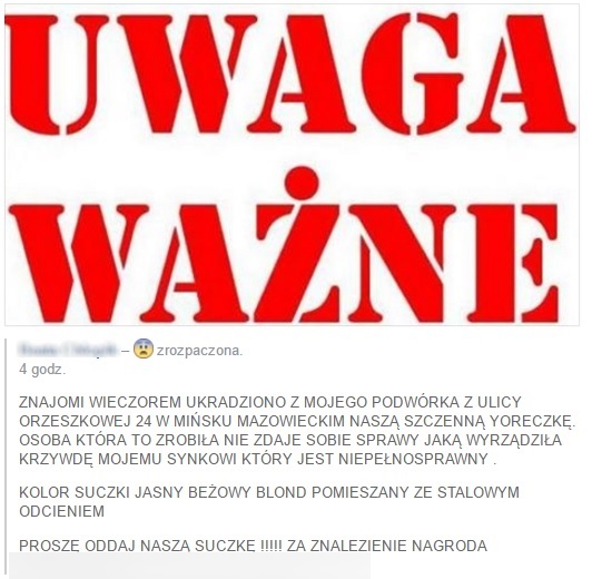 ZNAJOMI WIECZOREM UKRADZIONO Z MOJEGO PODWÓRKA Z ULICY ORZESZKOWEJ 24 W MIŃSKU MAZOWIECKIM NASZĄ SZCZENNĄ YORECZKĘ. OSOBA KTÓRA TO ZROBIŁA NIE ZDAJE SOBIE SPRAWY JAKĄ WYRZĄDZIŁA KRZYWDĘ MOJEMU SYNKOWI KTÓRY JEST NIEPEŁNOSPRAWNY .