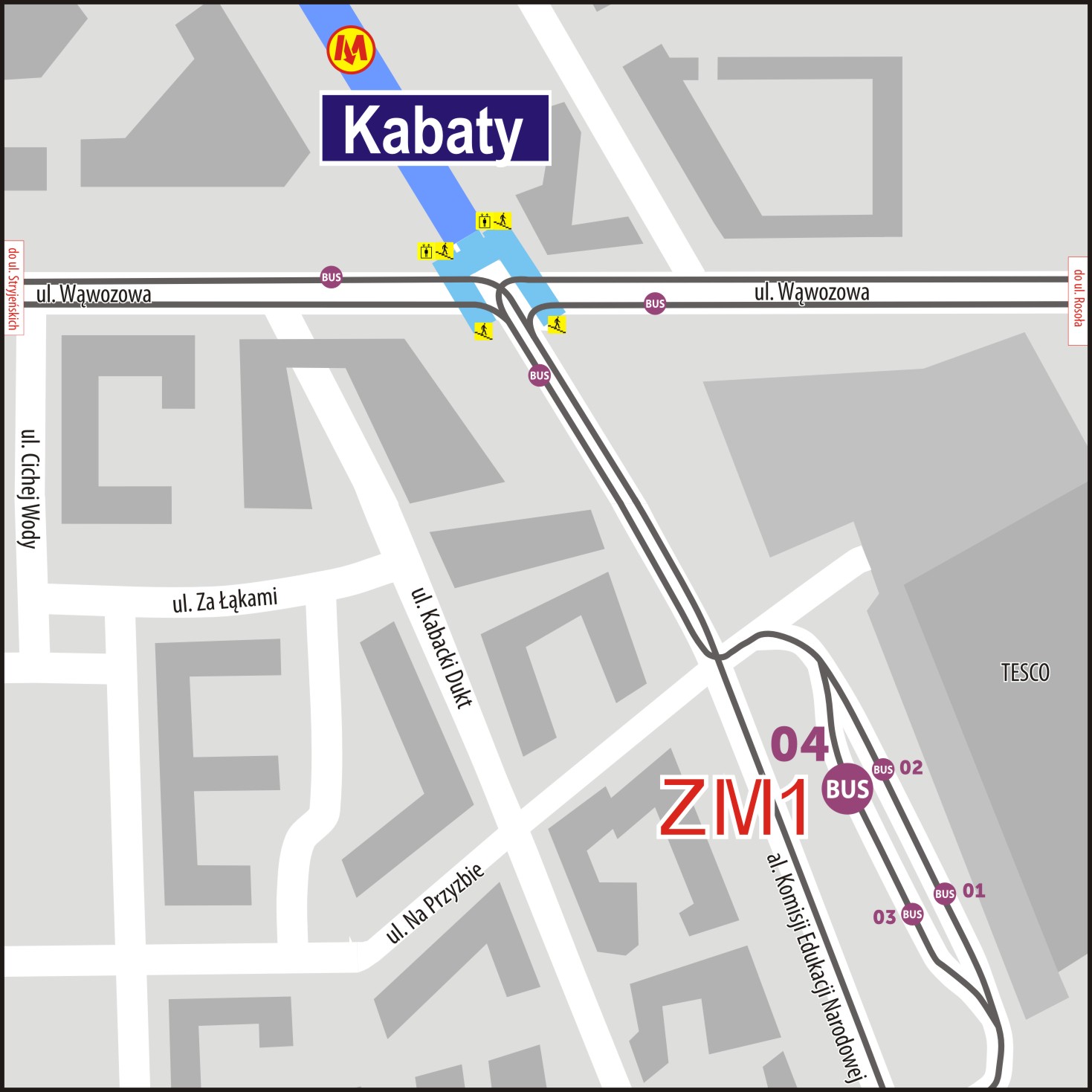 Na odcinku Wilanowska – Kabaty, w godzinach kursowania metra, zostanie uruchomiona zastępcza linia autobusowa ZM1, kursująca na trasie: