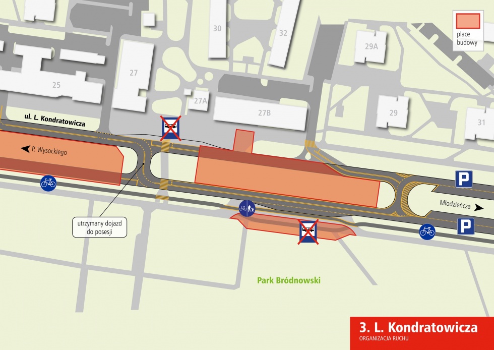 Jadący od strony ul. P. Wysockiego będą mogli przejechać przez skrzyżowanie z ulicami św. Hieronima i M. K. Ogińskiego, ale dalej możliwy będzie wyłącznie dojazd do budynków nr 7 po północnej stronie oraz 18 i 20 po stronie południowej. Połączenia z ul. L. Kondratowicza nie będzie miała Łabiszyńska. Zamknięty zostanie także wyjazd na ul. L. Kondratowicza drogą prowadzącą wzdłuż bazarku oraz w pobliżu budynków o numerach 4, 4A, B, C, D, E. Dojazd do tych bloków zostanie poprowadzony tymczasowym połączeniem wybudowanym od strony ul. Poborzańskiej. Od ul. Chodeckiej utrzymany będzie dojazd do budynków nr 25, 27, 27A i B, 29 i 31 oraz wytyczonych miejsc postojowych – część jezdni zajmie jednak plac budowy wentylatorni.
