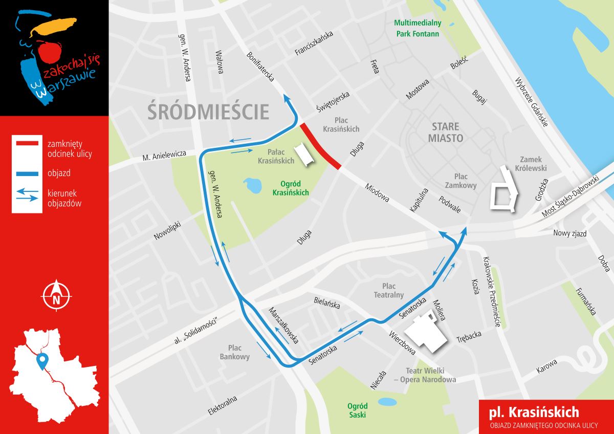 Jadący ul. Bonifraterską będą musieli się rozjechać w prawo lub w lewo w ul. Świętojerską. Podobnie będą musieli zrobić kierowcy dojeżdżający ul. Senatorską do skrzyżowania z ul. Długą. Możliwy będzie tylko dojazd do parkingu podziemnego. Objazd zamkniętego pl. Krasińskich zostanie poprowadzony ulicami: Świętojerska – gen. W. Andersa – pl. Bankowy – Senatorska.