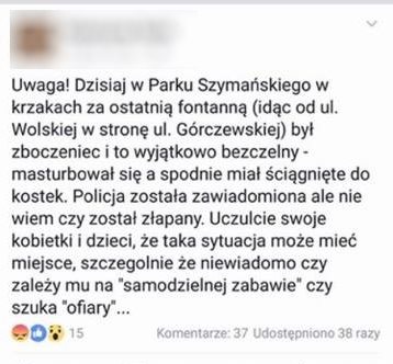 Wczoraj wieczorem miało miejsce bardzo nieprzyjemne zdarzenie. W Parku Szymańskiego nieznany mężczyzna masturbował się za fontanną. Na miejsce została wezwana policja. Całą sytuację opisała na Facebooku kobieta, która wezwała mundurowych.