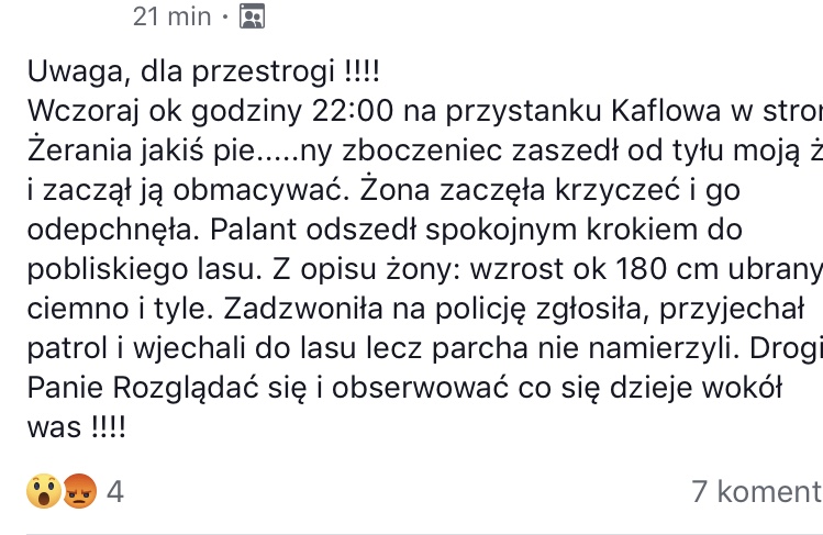 „Uwaga, dla przestrogi !!!! Wczoraj ok godziny 22:00 na przystanku Kaflowa w stronę Żerania jakiś pie…..ny zboczeniec zaszedł od tyłu moją żonę i zaczął ją obmacywać.” – ostrzega Pan Patryk.