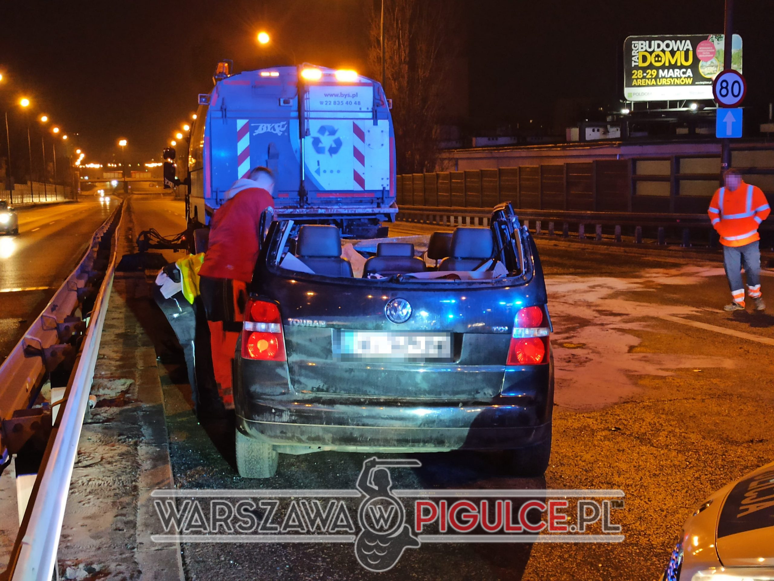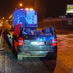 Volkswagen wjechał w tył zamiatarki. Konieczne było rozcięcie dachu! Dwie osoby trafiły do szpitala!