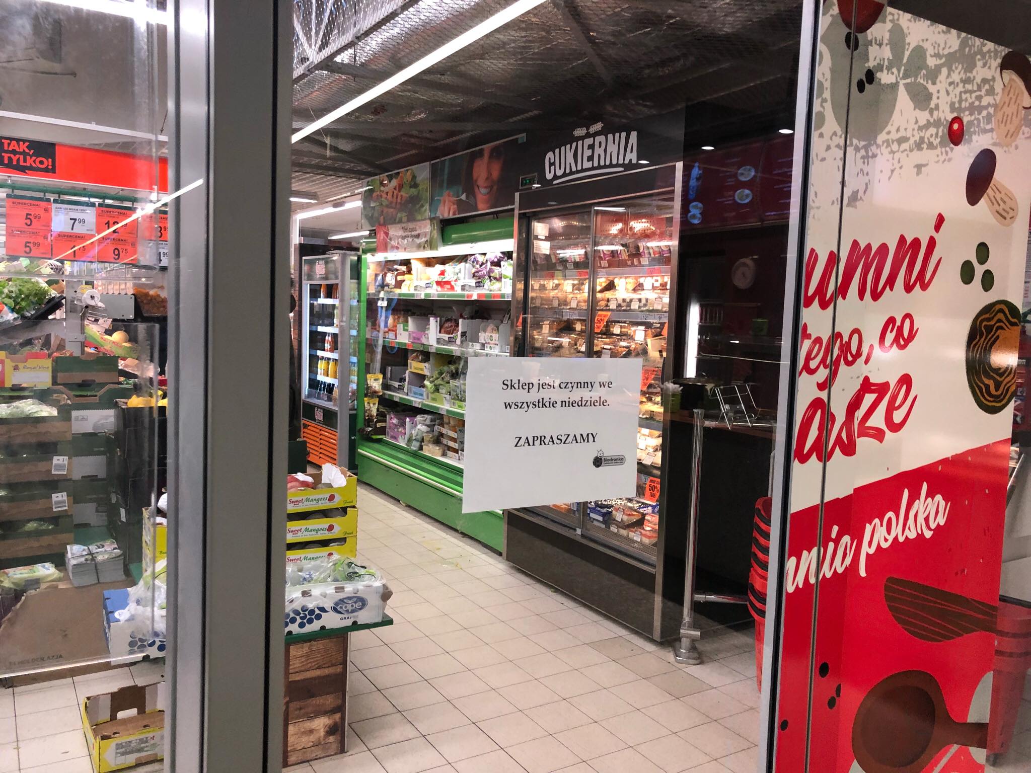 Okazało się, że Biedronka na Dworcu Wschodnim otwarta będzie we wszystkie niedziele, także te, które objęte są zakazem handlu! Potwierdza to kartka na drzwiach marketu.