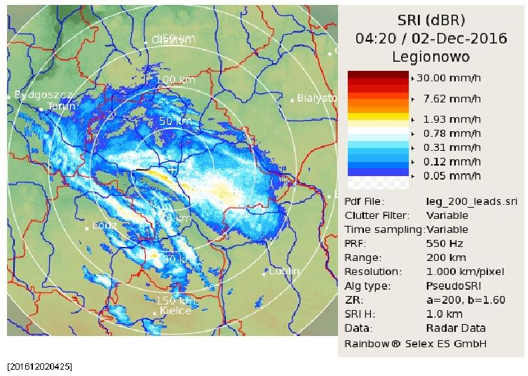 Tak olbrzymia była chmura z której napadało w stolicy co najmniej 10 cm śniegu – odczyt z radaru meteorologicznego (Źródło: IMGW-PIB)