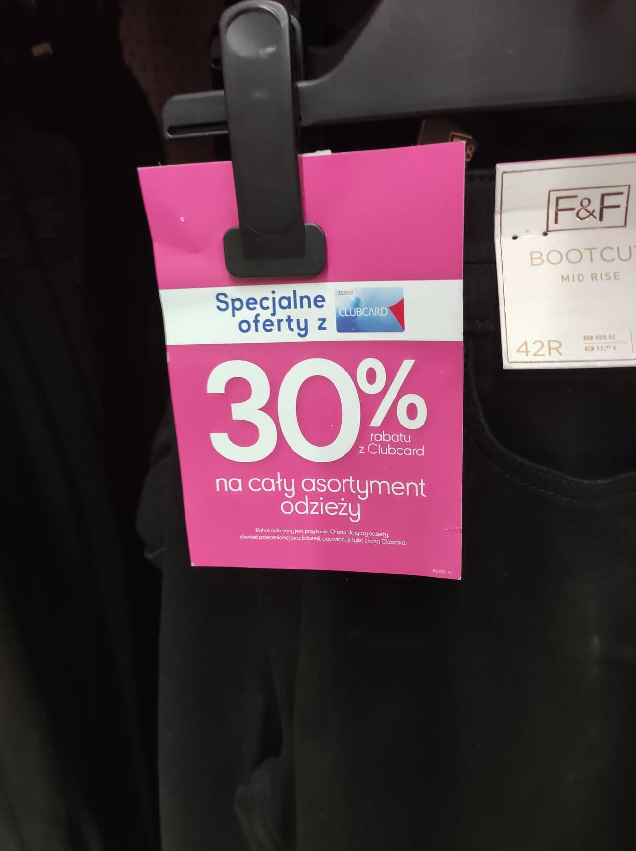 „Oferty specjalne z Clubcard. 30% rabatu z Clubcard na cały asortyment odzieży. Rabat naliczany jest przy kasie. Oferta dotyczy odzieży również przecenionej oraz biżuterii. Obowiązuje tylko z kartą Clubcard.” – czytamy na etykiecie, która wisiała w widocznym miejscu na samym początku alejki.