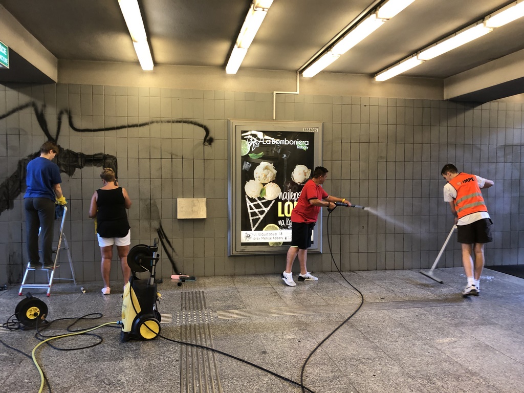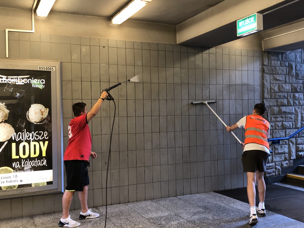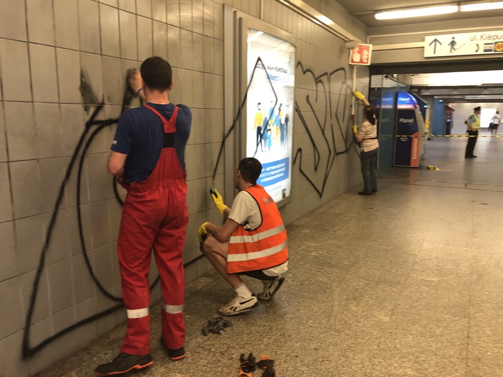 Ogromnej wielkości bohomazy pojawiły się przy wejściu do stacji metra Kabaty. Akt wandalizmu miał miejsce w nocy z czwartku na piątek. Następnego dnia zorganizowano czyszczenie.