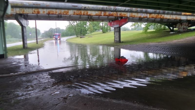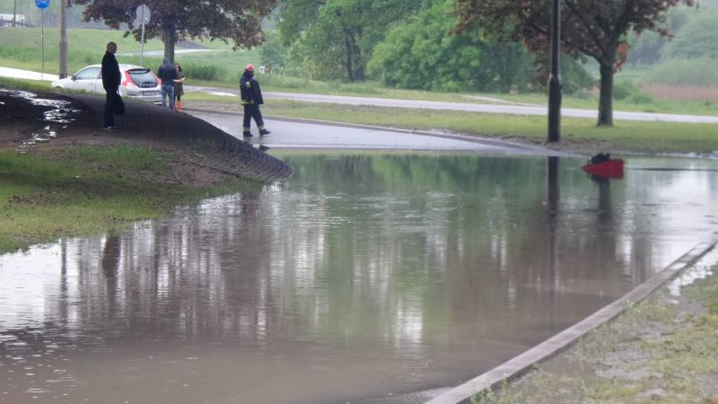 Na miejscu jest straż pożarna, która wypompowuje wodę z przejazdu.