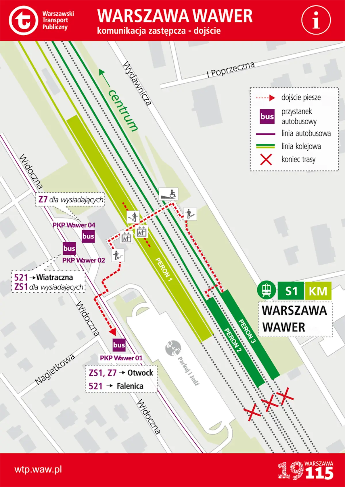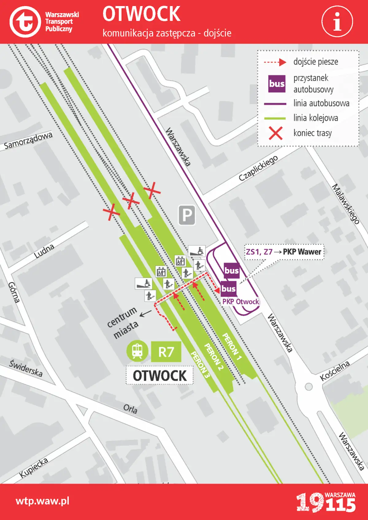 Główna linia zastępcza to ZS1, kursująca po zachodniej stronie torów od Wawra do Otwocka. Autobusy zatrzymują się na wszystkich przystankach pośrednich, w tym w Radości, Miedzeszynie, Falenicy, Michalinie, Józefowie i Otwocku Świder. Trasa przebiega ulicami: Widoczna w Wawrze, Patriotów przez Józefów (jezdnia zachodnia), następnie w Otwocku: Kołłątaja, Majową, Jana Pawła II, Warszawską aż do pętli przy wschodniej stronie PKP Otwock. W godzinach szczytu autobusy ZS1 odjeżdżają co ok. 10 minut, poza szczytem i w niedziele – co ok. 15 minut.