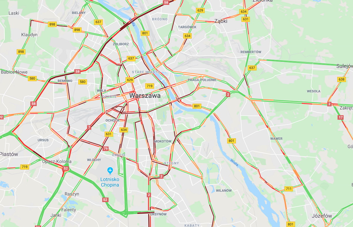 Sparaliżowane jest praktycznie całe centrum, większość mostów i trasa S8. Największe korki są obecnie w al. Prymasa Tysiąclecia, w Al. Jerozolimskich, na ul Puławskiej oraz w al. Wilanowskiej.