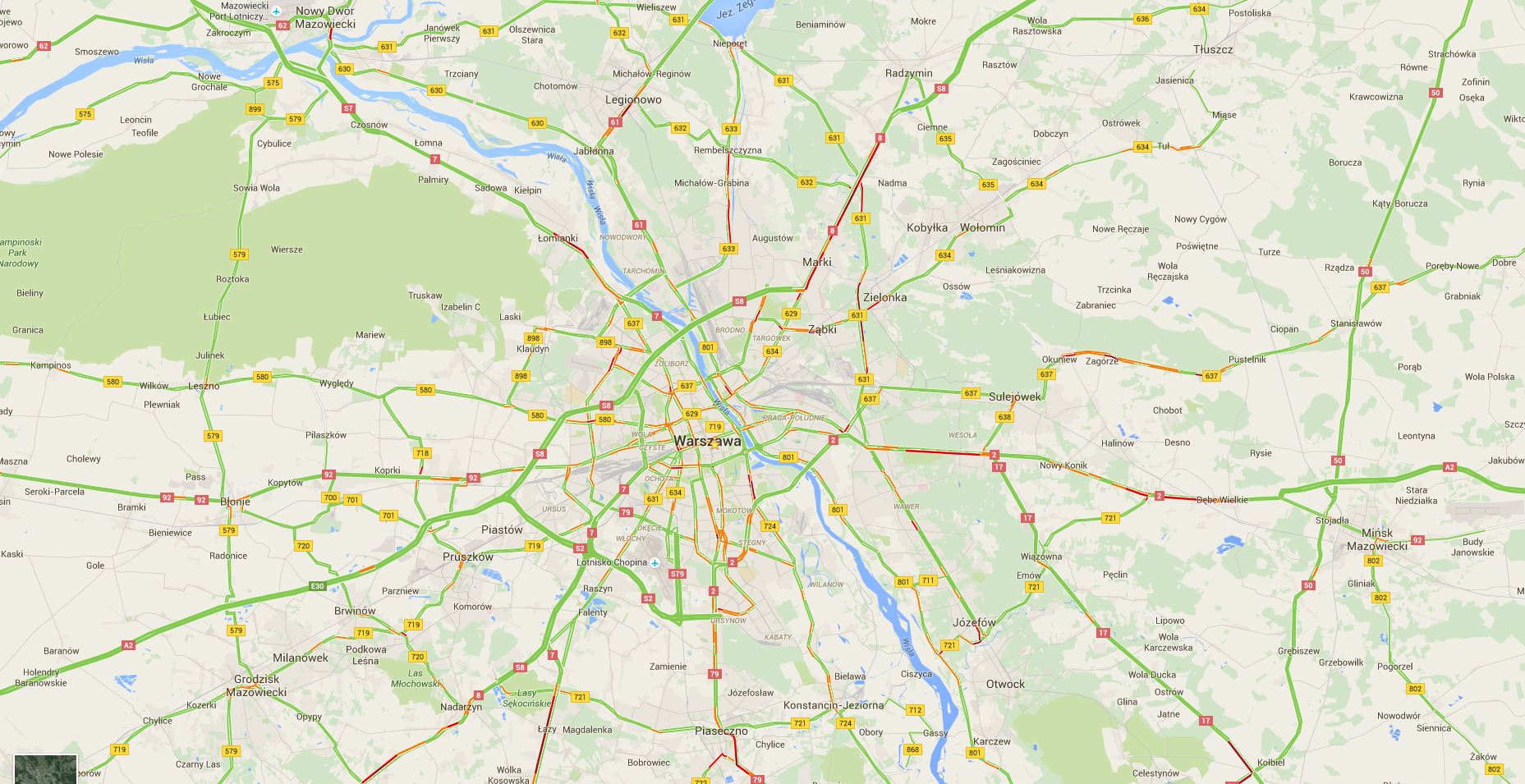Większość wylotówek z Warszawy stoi w długich korkach. Największe utrudnienia panują obecnie przy wyjeździe w kierunku Marek, Sękocina, Piaseczna i Mińsk Mazowiecki. Utrudnień nie ma tylko przy wjeździe na autostradę A2.