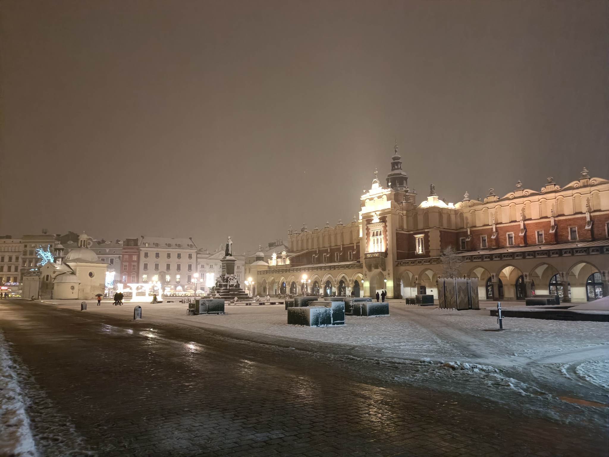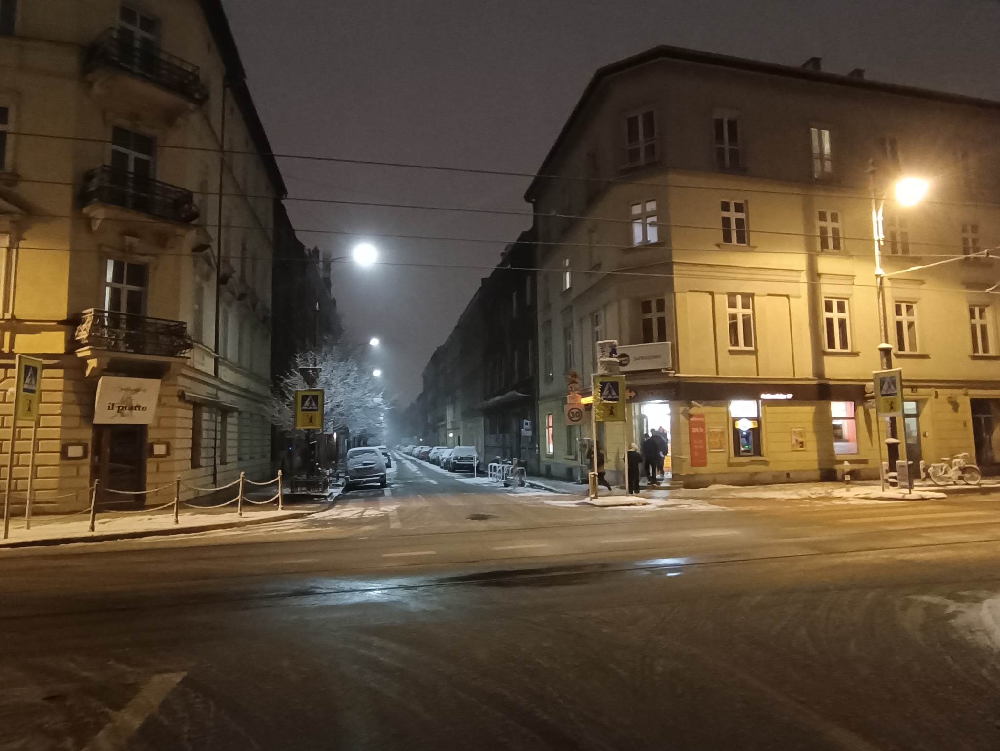 Na miejscu okazało się, że pogoda była dokładnie taka jak w Warszawie, a nawet może nawet gorsza, bo uwierzcie mi opady śniegu były naprawdę bardzo intensywne. Jak wiecie krakowskie Stare Miasto wieczorami i nocami żyje dużo bardziej intensywnie niż Warszawskie. Praktycznie całą dobę spotyka się tam masę spacerowiczów, imprezowiczów w różnym stanie humoru, czy tez upojenia. Oczywiście pochodzą oni z całego świata i tak samo było w piątek w nocy i to pomimo non stop padającego śniegu.