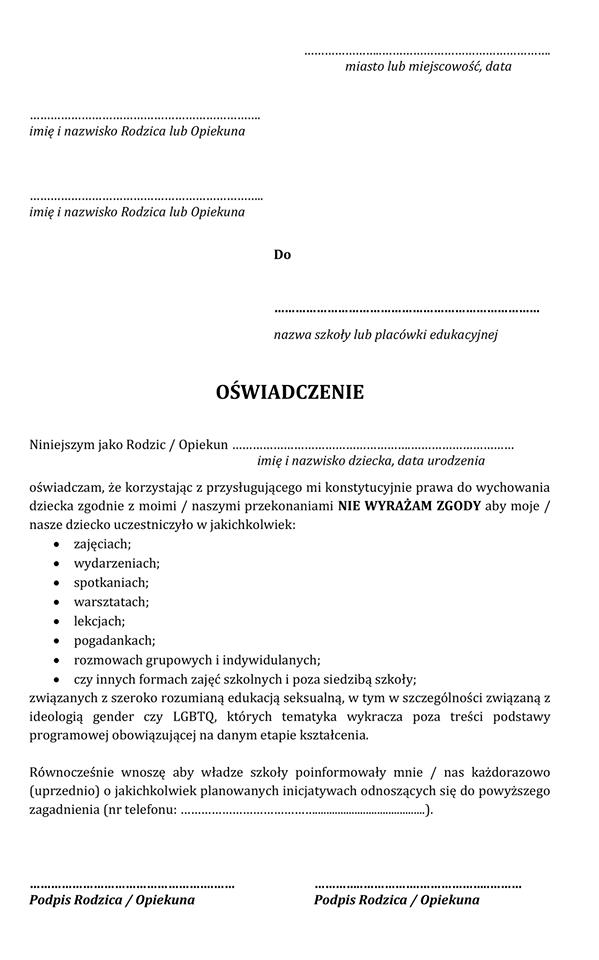„Wielu rodziców pyta o oświadczenie jakie można złożyć w szkole dziecka w ramach realizacji konstytucyjnego prawa rodziców do wychowania dzieci zgodnie ze swoim światopoglądem. Poniżej WZÓR OŚWIADCZENIA, które można wypełnić i złożyć w szkole.” – napisał radny Warszawy Dariusz Lasocki.