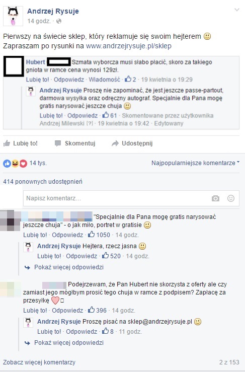 Któż nie miał problemów z hejterami i trollami? Mają je wszyscy. Niektórzy nie reagują, niektórzy usuwają wpisy, jeszcze inni (jak np. Filip Chajzer) upubliczniają dane, by napiętnować takie osoby. Jeszcze inni dają cięte riposty, jak Andrzej Rysuje.